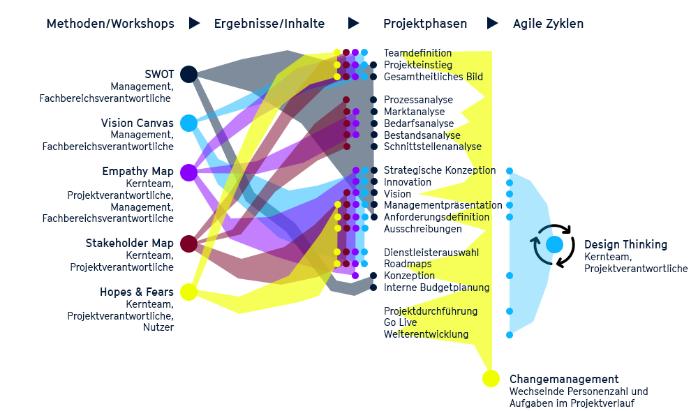 Wir finden den passenden Ansatz für die jeweilige Problemstellung, um die benötigten Ressourcen und Personen direkt zu Beginn in ein Projekt zu involvieren und so zielgerichtet auf die gewünschten Ergebnisse hinzuarbeiten.